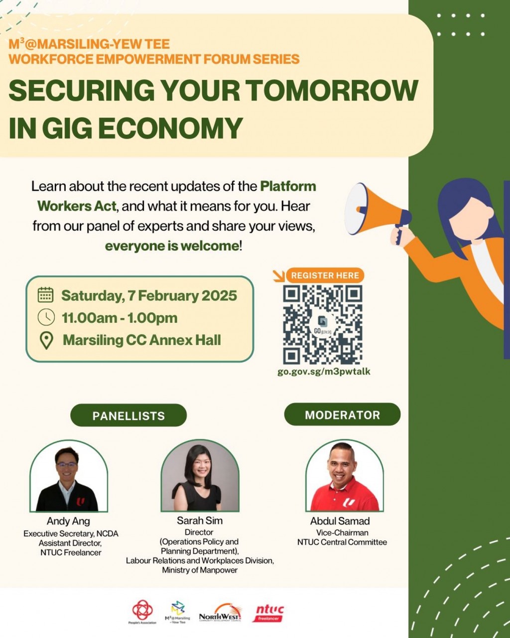 Gig workers, this one's for you! Ready to future-proof your work in the gig economy? Join us at "Securing Your Tomorrow in Gig Economy" - a M³@Marsiling-Yew Tee Workforce Empowerment Forum Series, and learn about the latest Platform Workers Act updates from our panel of experts.